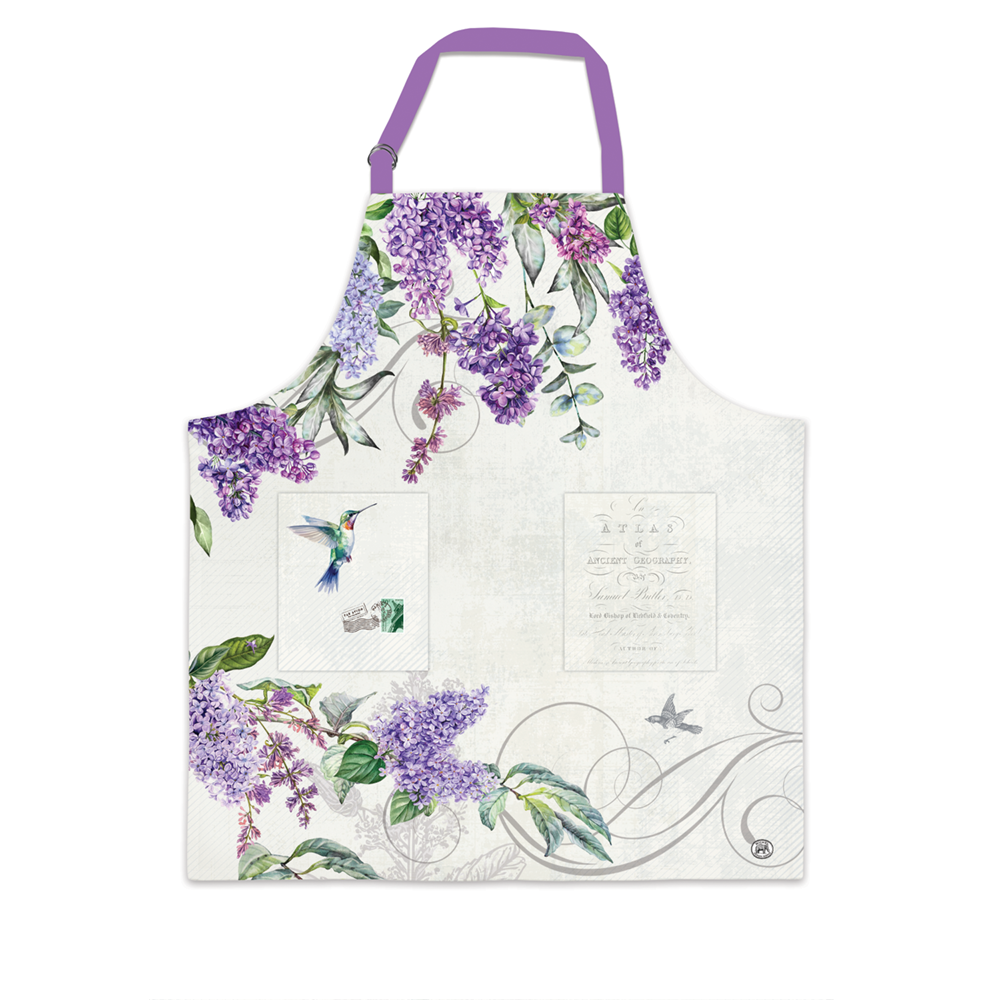 Hummingbirds flit about the branches of a French lilac bush, highlighting the beauty of spring’s freshest blooms. Featuring waist ties and metal double D-rings for easy adjustments, this cotton cooking apron is the perfect accompaniment to making your favorite recipes while keeping clothes clean.