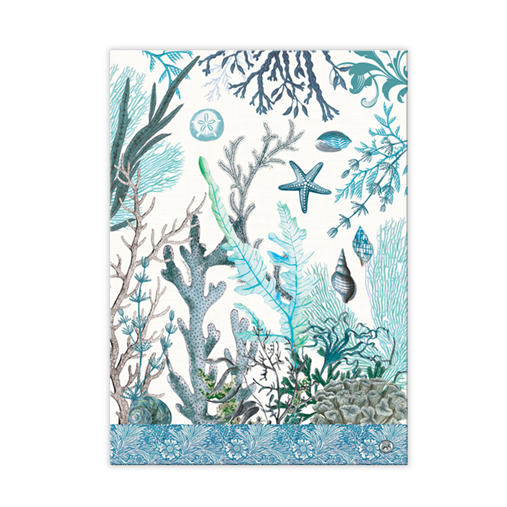 Cool, watery aquamarines evoke a gently moving tide and the serenity of the seashore, This beautifully-decorated 100% cotton towel will add gorgeous color and pattern to your kitchen. It also makes a great gift.