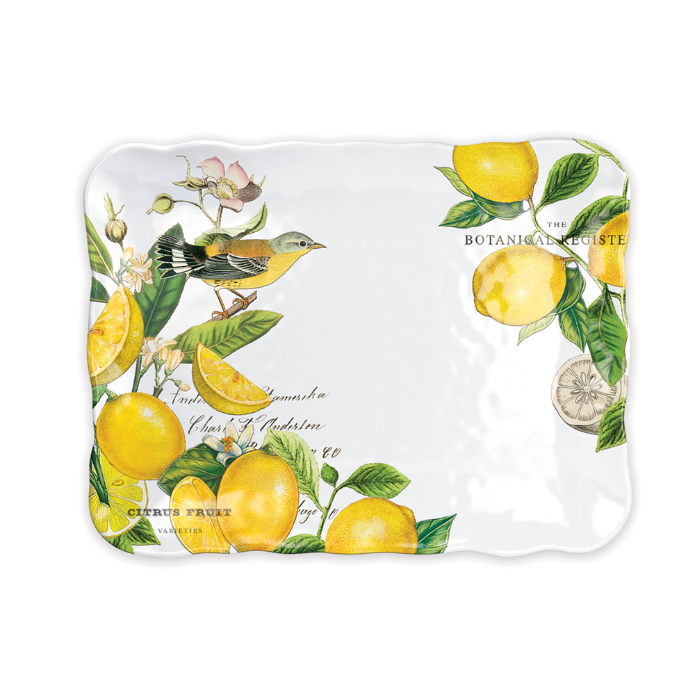 Juicy citrus and verdant herbs flourish against a clean white background. Featuring beautifully detailed artwork on dishwasher-safe melamine, this cookie platter adds a touch of elegance when serving desserts as well as hors d’oeuvres and breakfast favorites.