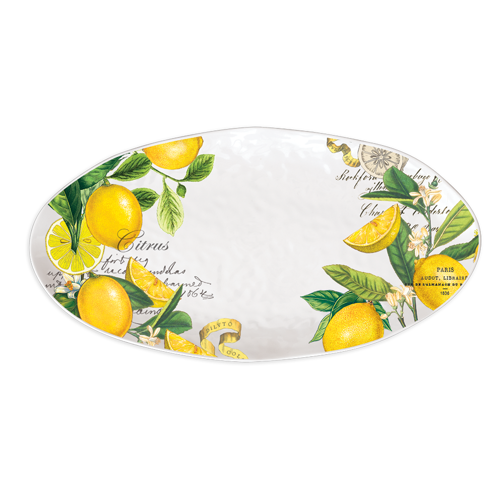 Juicy citrus and verdant herbs flourish against a clean white background. Featuring beautifully detailed artwork on dishwasher-safe melamine, this oval serving platter is perfect for presenting everything from corn on the cob and crisp baguettes to sushi and whole fish. It lends an elegant decorative touch to all sorts of gatherings!
